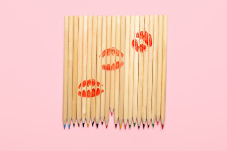 Colorful pencils with lipstick kiss marks on pink background