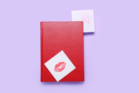 Book and paper sheets with lipstick kiss marks on lilac background