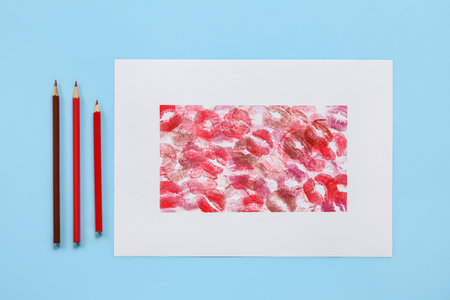 Paper with lipstick kiss marks and pencils on blue background
