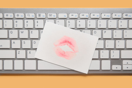 Paper with lipstick kiss mark and computer keyboard on beige background, closeup
