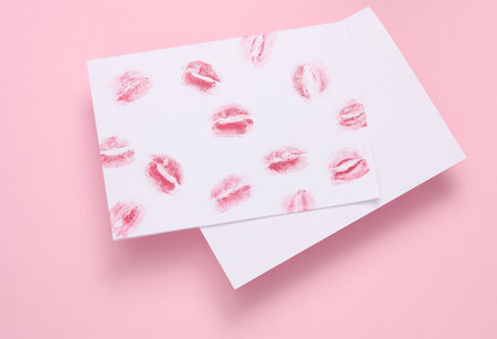 Blank card with red kiss isolated on pink background, conceptual image of love & Valentine's day holiday