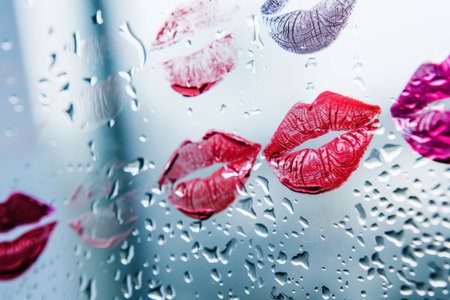 Assorted lipstick kiss prints in multiple shades on a misted glass surface with water droplets. Creative makeup and beauty concept. High resolution image suitable for makeup advertisement, poster, or header with copy space.