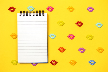 Joyful pattern of colorful lips on yellow background with a small rooled notepad on top, copy space flat lay