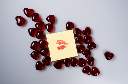 Imprint of female lips with red lipstick on a sticker surrounded by hearts from glass