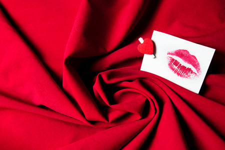 Bright lip print with red lipstick on white paper on black fabric close-up, symbol of kiss and romance, love and message