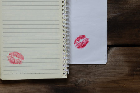 An album sheet and a notebook with lines on a spiral lie on a wooden table, at the bottom of the page there is a clear trace of a kiss with red lipstick close-up