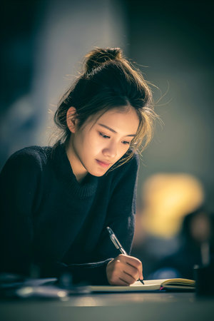 Young woman in black sweater focused on writing in a notebook under soft lighting in a calm indoor setting, vertical. High quality photo