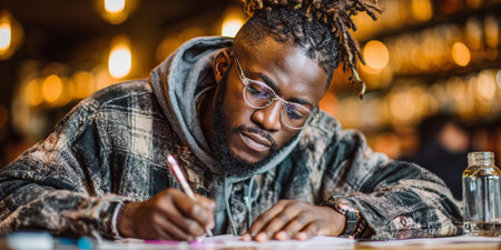 A person is writing in a notebook with a blue pen, wearing a bright yellow jacket. The atmosphere is warm and inviting, making it an ideal space for creativity.