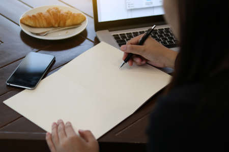 Woman hand is writing on a notepad with a pen in office.Web banner.