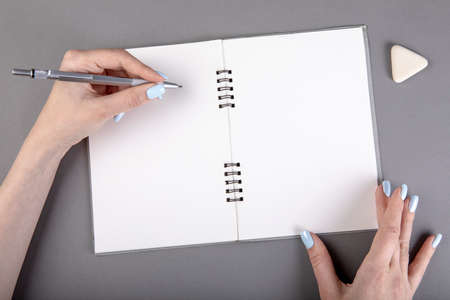 Closeup shot of hand young student lady freelancer journalist writing article using copybook in gray modern home office. Remote Job, Education And Career Profession Concept. Copy space