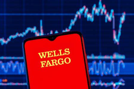 Kazan, Russia - Jan 30, 2022: Smartphone with Wells Fargo bank . Wells Fargo stock chart on the background.