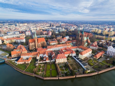 Aerial view of Wroclaw cityscape panorama in Poland. Cathedral of St. John on Tumski island, bird eye view