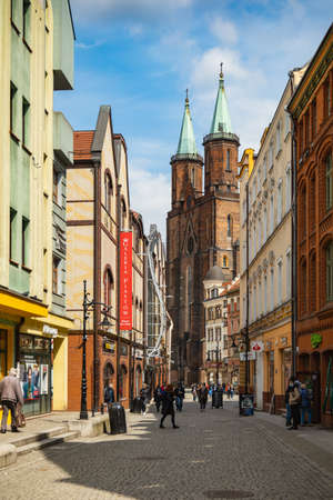 WROCLAW, POLAND - OCTOBER 14, 2021: Old city streets. In the background is the Cathedral of St. John the Baptist.