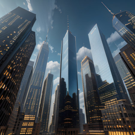 A sleek skyscraper rises high into the bright sky, its glass facade reflecting clouds above. Surrounding buildings add to the vibrant city atmosphere on a clear day.