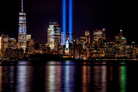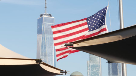 New York City waterfront skyline, Manhattan Downtown Financial district, World Trade Center building, riverfront skyscrapers. USA american flag 11 September remembrance. New Jersey, United States.