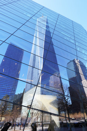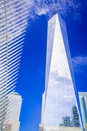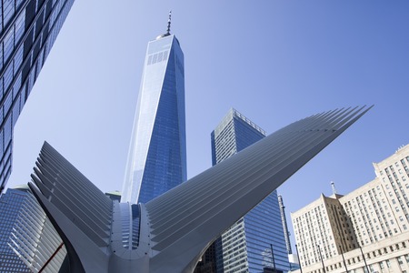 New York City - april 15: The One World Trade Center and memorial site in New York with blue sky on April 15, 2016