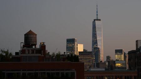 New York City Manhattan downtown skyline cityscape. Financial district rooftop view from Chelsea, Midtown. Buildings roofs. urban architecture, United States. World Trade Center and water tower tank.