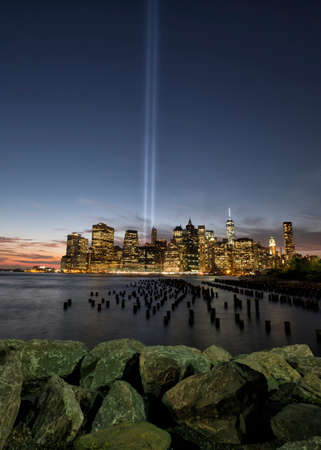 View of light beams over Lower Manhattan from Brooklyn Heights Promenade at night, New York, USA