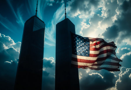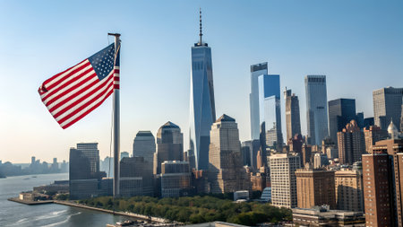 American flag flutters in the breeze, with a backdrop of contemporary skyscrapers and a vibrant city skyline under a bright blue sky, representing national pride