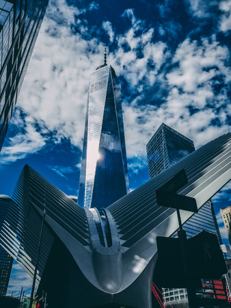 The One World Trade center or Freedom Tower located in New York City. Architectural modern buildings at lower Manhattan skyline in United States of America