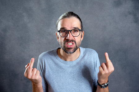 Portrait of a young man showing middle finger gesturing fuck isolated on white background
