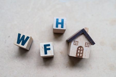 Wooden Blocks Representing WFH Concept, Work From Home text placed and home model. Top view