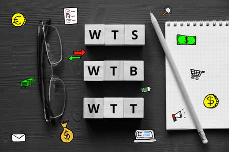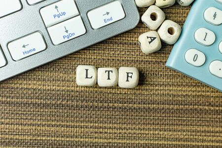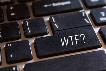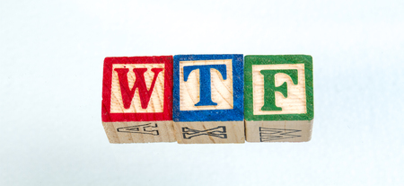 The phrase WTF visually displayed on a white background using colorful wooden blocks image with copy space in landscape format
