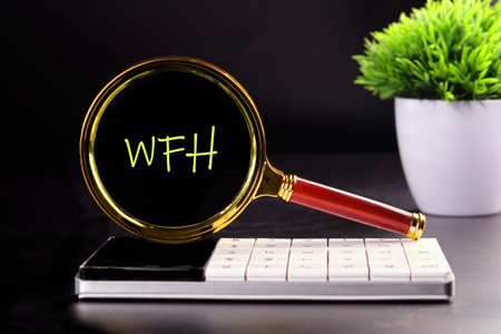 WFH Work From Home text concept. WFH written appeared through a magnifying glass on a black background with a green plant in the background without focus