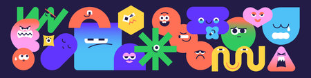 Composition of various geometric shapes with emotions on faces. Different figures- happy heart, sad square, crying, scared and angry circles, curves and lines. Flat isolated vector illustration