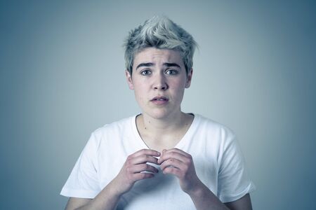 Portrait of young scared teenager man in shock making frightened gestures. Transgender teen suffering victim of threats and violence aggression. In People Gender Diversity and transphobic bullying.