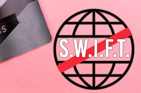 Prohibition of SWIFT sign on the pink background. The concept of international finance commercial relations.