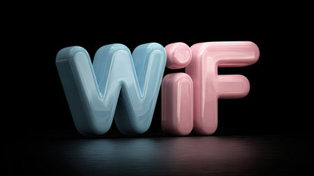 The image features three-dimensional text composition reading WiFi. The letters are rendered in a glossy, pastel aesthetic, with the W and I in light blue and the two Fs in soft pink. Set against a stark black background, the composition is well-lit, highlighting the smooth textures. Suitable for web design or advertising.