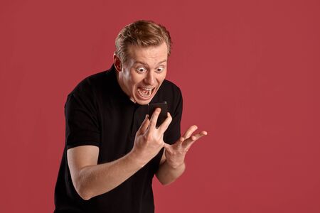 Close-up portrait of a ginger guy in black t-shirt posing on pink background. Sincere emotions.