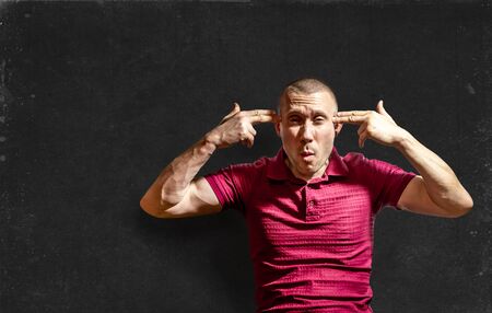 The man put his hands to his head with fingers in the shape of a gun against the background of a chalkboard