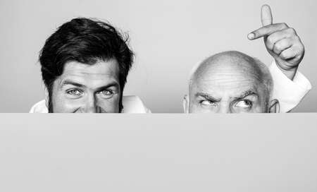 Hair loss, baldness. Middle aged and senior bald man face close up. Copy space for text. Paper baner, blackboard.