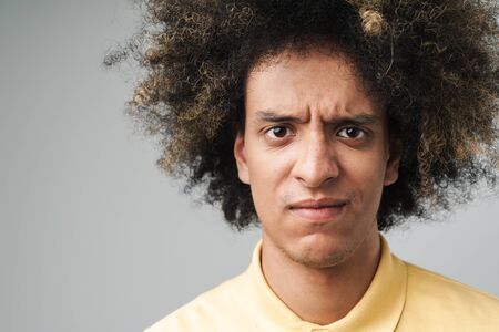 Photo closeup of uptight caucasian man with afro hairstyle frowning at camera with sad look isolated over gray background