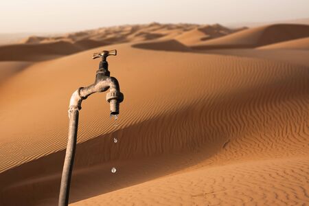 Dripping tap and desert environment in the background, concept of the drying up of the planet and water scarcity
