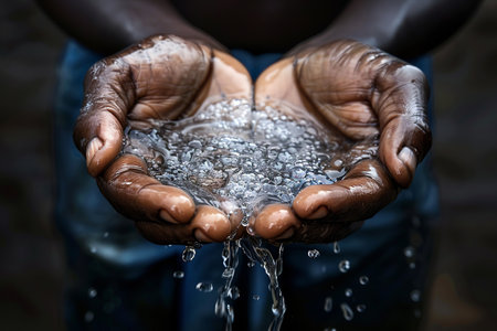 Close-up image shows hands cupping clear water, with droplets and splashing effects. The texture is detailed, with a focus on liquid movement and interaction. The lighting appears soft, indicating an indoor or shaded environment. Suitable for conceptual illustrations related to resources and hygiene.
