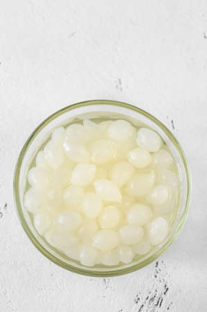 Glass bowl of pickled cipollini onions