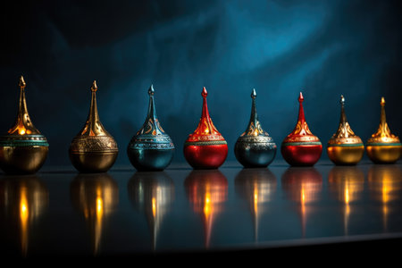 diwali lamps in a row on a metallic surface, created with generative ai