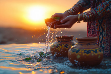 Egyptian woman pours water from a bowl into decorative pottery jars during sunset, highlighting cultural traditions and the importance of water conservation