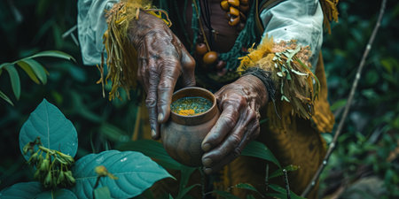 Hands of an Indian man with a teapot in the jungle