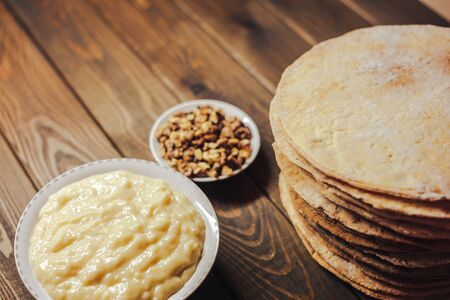 ingredients for baking homemade cake. shortcakes, buttercream or cream and nuts on a plate on vintage wooden kitchen table. copyspace for cook recipe.