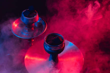 hookah bowl and coals close up on a black background with smoke