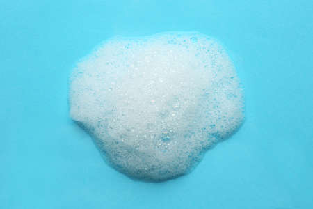 Face cleansing mousse sample. White cleanser foam bubbles on blue background. Soap, shower gel, shampoo foam texture closeup.