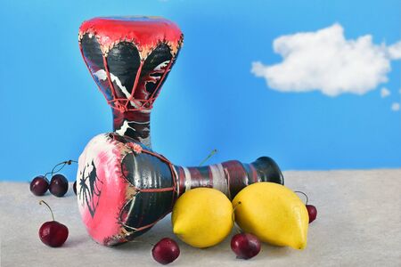 tropical background with tribal drums, cherries and lemons