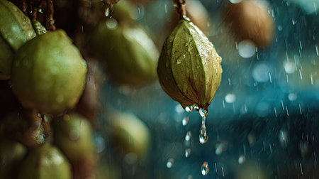 Soft rain falling gently on Betel nut, with water droplets forming and slowly dripping. The background is softly blurred with a natural, moody atmosphere.
