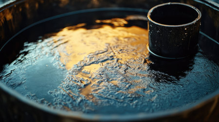 A pool of crude petroleum in a small metal container, reflecting light on its oily surface. No people, copy space