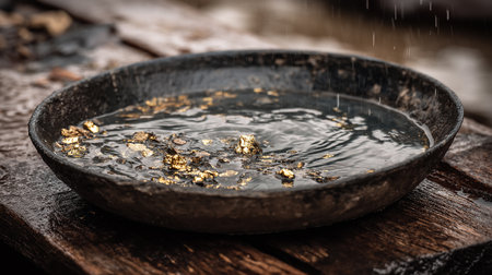Frying pan full of gold on wooden table with black background.