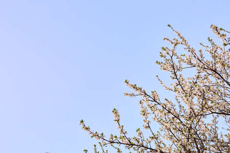 Blooming tree branch close up next to clear blue sky in a sunny spring day. Nature background for blogs, seasonal cards and web design. Selective focus